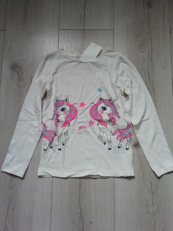 Довжина 43 см, пог 30 см до 34см. Довжина рукава від шиї 46 см, від шва 40 см. Добре тягнеться. Малюнок з відблиском. Колір більш до молочного