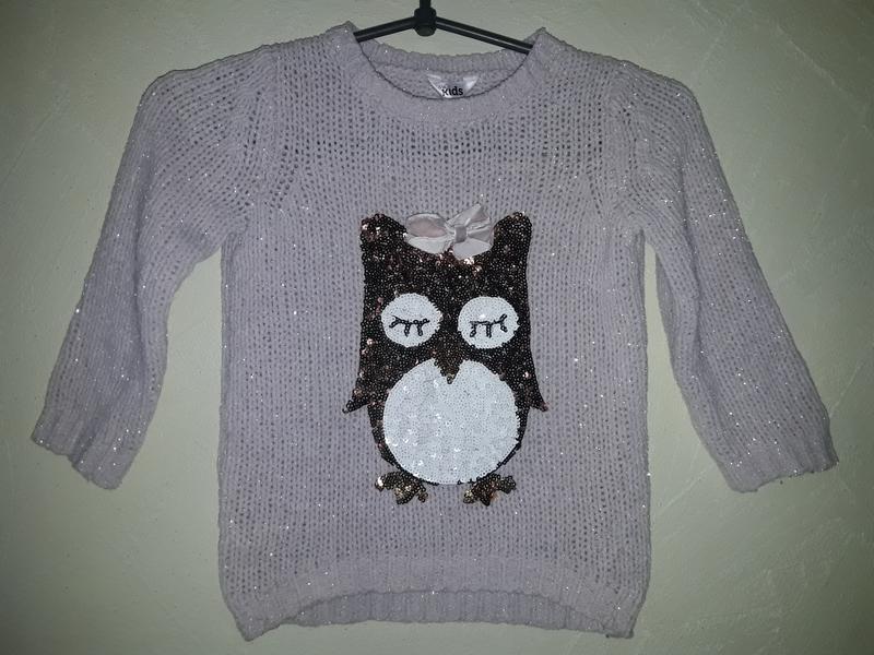 Свитшот крупной вязки с люрексовой нитью,блестит,шикарный принт из блестящих пайеток совенок. Отличное состояние