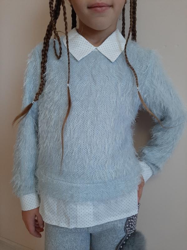 Кофта-обманка Травка Цвет- светло-голубой Замеры: длина от плеча до белого/общая длина от плеча/ширина под ручками/рукав от плеча 134-37/45/33/47