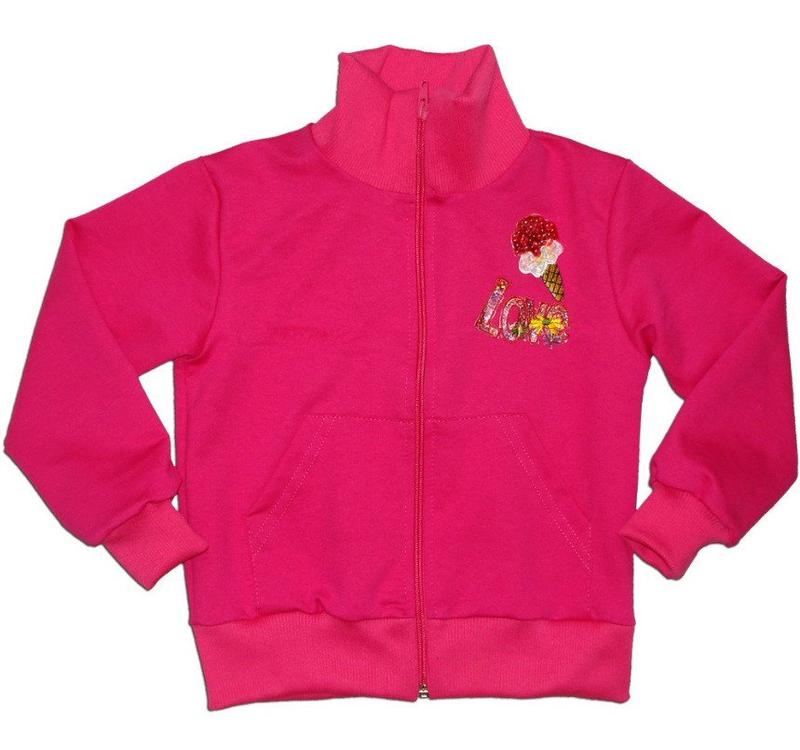 Красивая кофта для девочки на молнии, воротник стойка, низ рукавов на манжетах. Украшена аппликацией. Цвет: Малиновый; Полотно: Футер без начеса (2-х ниточный); Состав: 95% хлопок, 5% эластан; Оформление: Аппликация ; В наличии рост 98, 104, 116