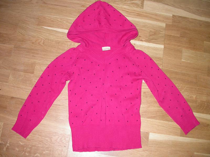 Шикарный свитерок цвета фуксии+мелкий черный горох.На рост 110-116см. Тонкий вязанный трикотаж.Длина 42см, рукав от горловины 42см, между руками 32см. Глубокий удобный капюшон.. Состояние безупречное.Фирменная. Цена 90грн