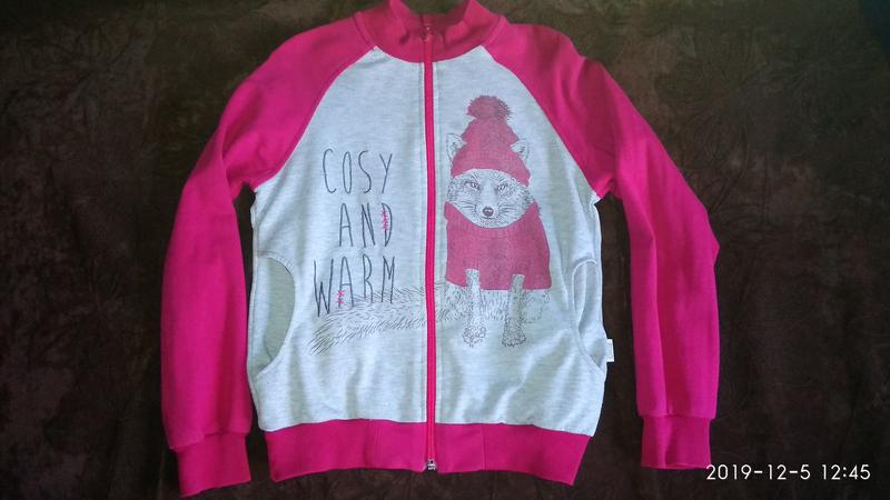 кофта 50 хлопка 50 эластан, хорошо тянется. состояние идеальное молния работает. на 6-7 лет до 122-128 хорошо тянется.