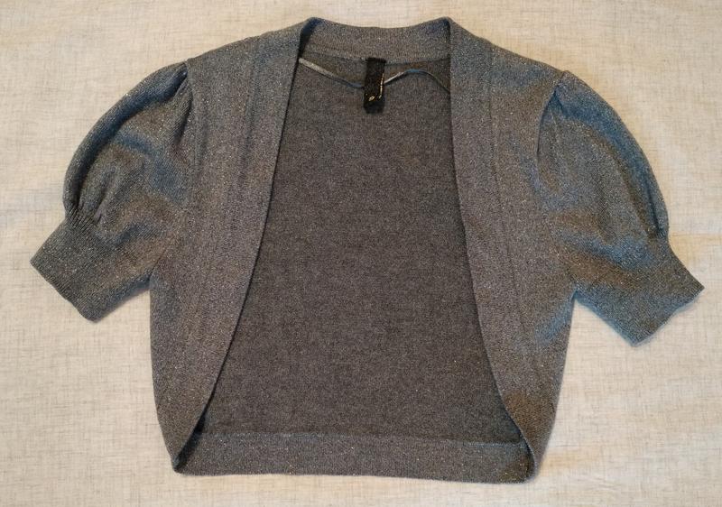 Серое болеро для девочки, размер 8 Очень красивое, серая ниточка с люрексом. Замеры: длина по спине 36 см, длина рукава 19см, охват манжета на рукаве 18 см, ширина манжета на рукаве 5,5 см, длина плеча 7 см, ширина спины по плечам 31 см, ширина спины под проймой 33 см