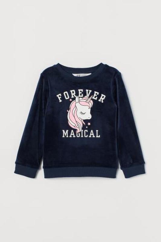 Велюровий светрів H&M на дівчаток м'який як зовні так і всередині, темно-синій колір і малюнок На грудях єдиноріг 95% поліестр 5% еластан Виміри 4-6 років ширина під пахвами 35, довжина 40, ззаду 42, рукав від плечового шва 40, плечі 29см 6-8лет ширина під пахвами 37, довжина спереду 46см, ззаду 41см, рукав від плечового шва 50см, плечі 27см 8-10років ширина під пахвами 40, довжина попереду 50см, ззаду 55см рукав від плечового шва 54см, плечі 28см