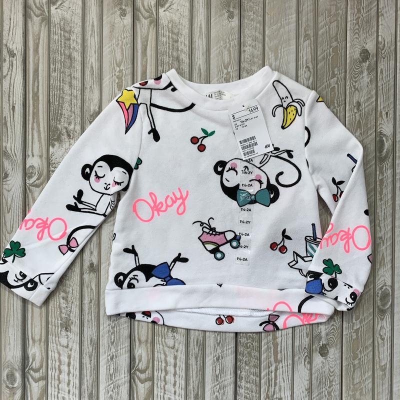 Милый свитшот H&M. Размер - 1,5-2 года (рост - 92 см.). Ткань- френч-терри. Замеры: Длина по спинке (от плеча): 33 см Длина перед: 31 см Плечо: 7 см. Длина рукава: 32,5см. Шииина по плечам: 25 см ПОГ- 29,5 см