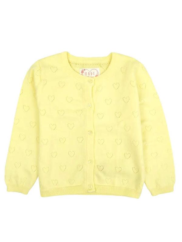 Отличная кофта на пуговицах для девочек от Primark. Кофта тонкой ажурной вязки в сердечки, желтого цвета с застежкой на пуговицы. Состав 75% хлопок и 25% полиэстер. В наличии есть размеры: 98 на 2 - 3 года. Длина 36, ширина под руками 31, плечи 26, рукав 35 Цена 287 грн.