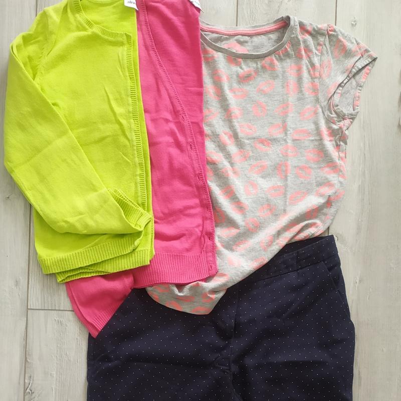 Шикарный look для девочки из четырех вещей за 2️⃣0️⃣0️⃣грн В набор входит : ☑️Два ярких джемпера, малинового и салатового цвета на рост 140, 8-9 лет фирмы alive ☑️Брюки темно синие в мелкий горошек с карманами, застёжка замочек и крючки, фирмы Tu на рост 140, 8-9 лет ☑️Крутая футболка серого цвета с губками Оранж, на 8-9 лет.