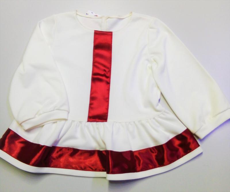 Красивая детская кофточка с баской. Модно, нарядно под джинсы,по низу нашита атласная лента.Сзади застёжка на пуговку.Прямого покроя.Подойдет для школы. Ткань французский трикотаж. Производство: Украина, ТМ Ласточка. Качественный пошив. Замеры: 128р От подмышки до подмышки 34см ПОТ 34см Длина до талии 30см Длина кофточки 43см Длина рукава 33см