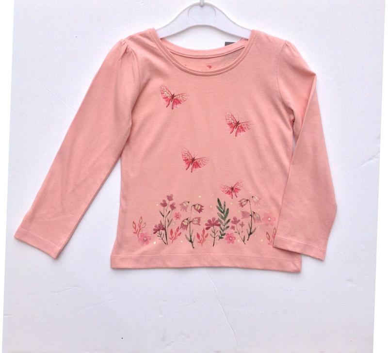 Реглан с принтом "Бабочки, цветочки" Декорирован глиттером (не осыпается) Размеры: 92 см (1.5-2 года) Цвет розово-персиковый 100% бавовна Доставка: Новая почта, Укрпочта в средину, Четвер Условия оплаты: *По полной предоплате на карту (Новая почта, Укрпочтта) *По предоплате 200 грн, остальные наложенным платежем (Новая почта). Обмену и возврат нет.