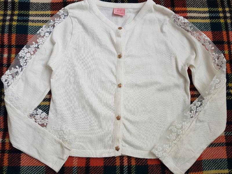 Кофта болеро.Стан ідеальний.Колір не білий,ближче до молочного.Матеріал приємний.нажаль,бірку обрізала. Одягнена 1раз. Заміри плечі 30 грудей 38 довжина 42.5. рукав 50.
