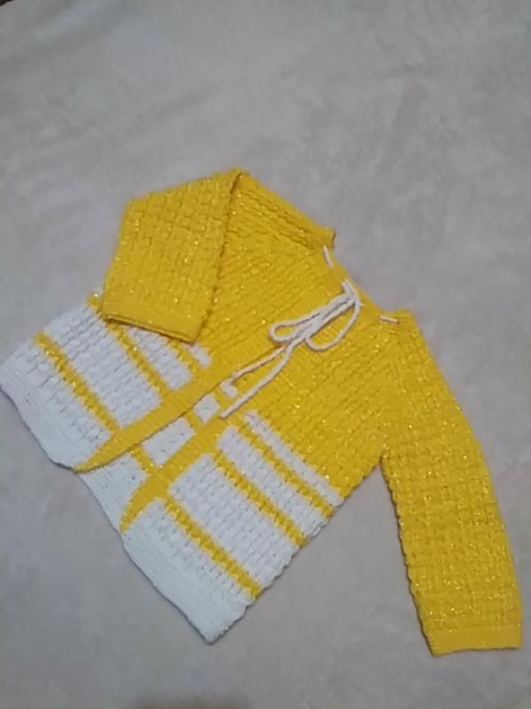 Моя работа, вязала для своей внучки, одевалась мало, в идеальном состоянии, катышек нет, нитка акрил с люрексом,связана регланом, боковых и плечевых швов нет, только рукава сшиты. Длина 32, под мышками 25,5, длина рукава от горловины 30.