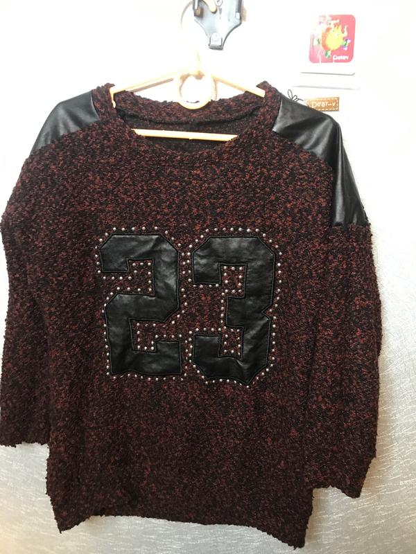 Свитшот очень стильно смотрится,дефектов нет,рукав 3/4,длина спереди 51,сзади 56,плечи спускающиеся,померять тяжело рукав,если от горловины мерять то 47 см,если от кож вставки 31,под руками ширина 42