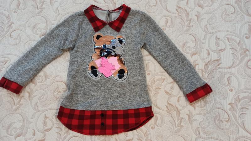 Кофта для дівчинки,приємна тканина,медведик міняє колір(це можна побачити на фото),дефектів немає.Довжина 52 см, довжина рукава 40 см. Якщо цікавить більше інформації,то пишіть ,відповім на всі питання.