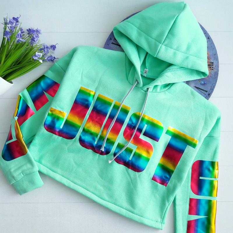 480 грн Худі укороченый JUST ⭐Тканина : тринитка на флісі ⭐Колір: чорний ⭐Додатково: райдужний голограмнный накат ⭐Виробник Україна ВИМІРИ ДОВЖИНИ І РУКАВА ВІД ГОРЛОВИНИ р. 34(приблизно 134)-довжина 40 см /ПОГ 44 см/рукав 61 см-1шт р. 36(приблизно 140)-довжина 43 см /ПОГ 46 см/рукав 66 см-1шт р. 38(приблизно 146)-довжина 47 см /ПОГ 49 см/рукав 68 см-1шт р. 40(приблизно 152)-довжина 47 см /ПОГ 49 см/рукав 70 см-1шт р. 42(приблизно 158)-довжина 49 см /ПОГ 50 см/рукав 70 см-1шт