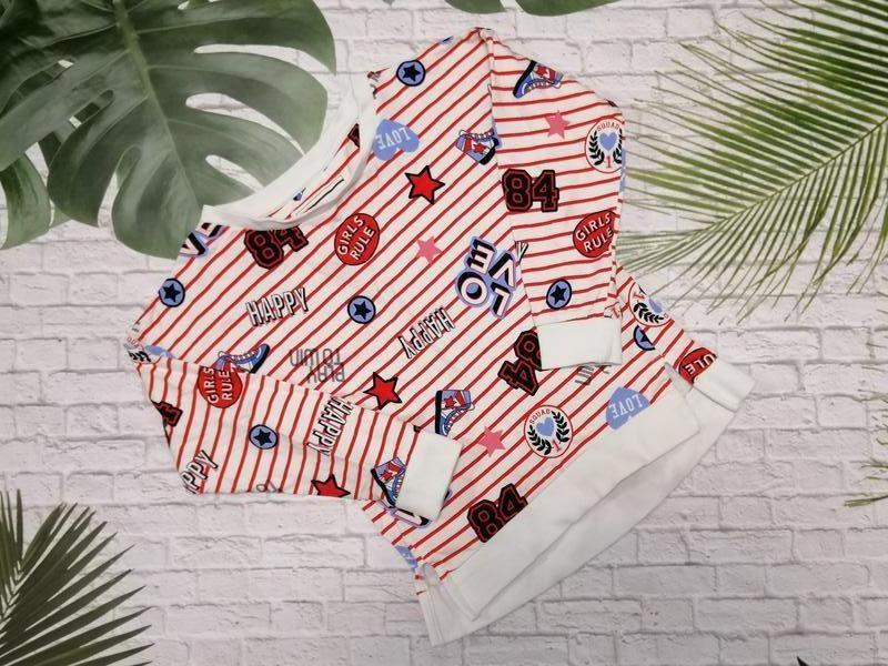 На етикетці вказано на ріст 116 см. Виміри в спокійному стані: довжина 40/43,5 см, ПОГ 37 см, рукав приспущений 30,5 см + 13 см плече. 100% бавовна. Виробництво Бангладеш. Стан відмінний.