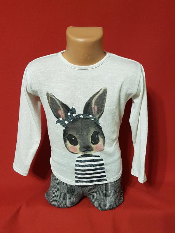 Свитер с зайкой от H&M 3-4. Возраст 3-4, рост 98-104, длина 39/42 (немного удлиненный сзади), рукав 32, плечи 29, ОГ 64, ОТ 62, ОБ 64. Состав: 53% полиэстер, 44% вискоза, 3% эластан. В хорошем состоянии, рисунок не потрескан!
