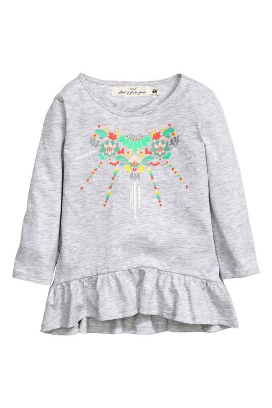 На рост 98/104 см (2-4 года) Трикотажный топ с длинным рукавом, с принтом спереди. На топе декоративный волнистый край горловины и волан снизу. Спинка немного удлинена. 100% бавовна Доставка: Новая почта, Укрпочта в средину, Четвер Условия оплаты: *По полной предоплате на карту (Новая почта, Укрпочтта) *По предоплате 200 грн, остальные наложенным платежем (Новая почта). Обмену и возврат нет.