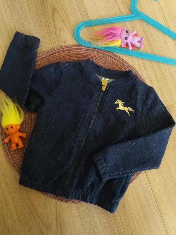Нова класна кофтинка на дівчинку 1,5-2.5р.На замочку, як жакетик чи легенька курточка,манжети і низ кофточки оброблені резинкою, декорована коником, колір темний синій блискітками . Дуже гарна, стильна, котонова, зручна кофточка .