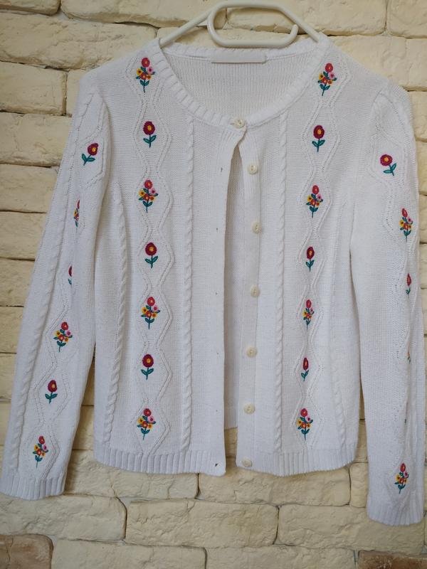 Кофта белая акриловая с вышивкой. Красивая и актуальная. Покупали в Вайкики для школы. Тянется. Замеры: Длина 50 ПОГ 42 Рукав 54+9 плечо. Состояние очень хорошее, без дефектов. Перешлю после оплаты на карту, возможен наложенный платеж.