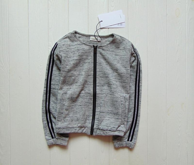 Новая стильная кофта для девочки. Застёгивается молнией. На рукавах серебристые полосы. Внутри трехнить. Цвет - серый меланж. Материал тянется. Шикарное качество. Name it {Дания}. Спортивная кофточка mame it Возраст9-10 лет 134 см Замеры Длинна 43 ПОГ 39 Рукав 43.3