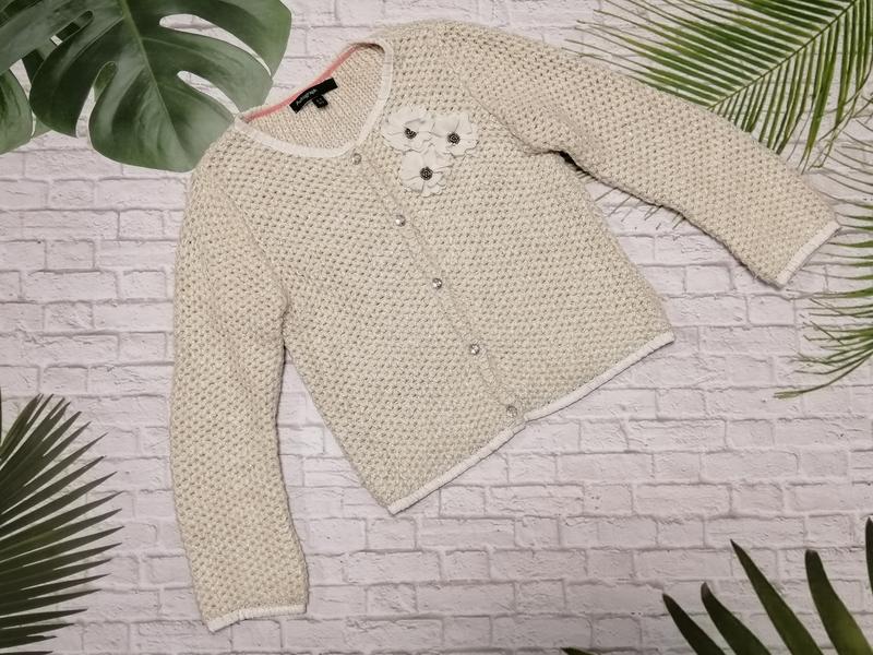 На этикетке указано на рост 122 см. Замеры в спокойном состоянии: длина 38 см, ПОГ 33 см, рукав 41 см. 96% хлопок, 2% полиэстер, 2% металлизированная нить. Производство Индии. Состояние отличное, объемная вязка.