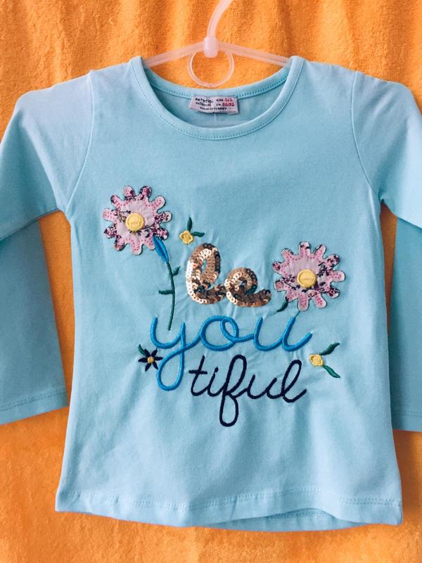 Очень нарядная кофточка вашему ребенку в ней будет очень комфортно.. Цвет нежно голубой. Аппликация на груди , пайетки Трикотаж мягкий Состав 96% соттон. . Размер 86, ширина груди 27см, рукав 33см , длина 41см.