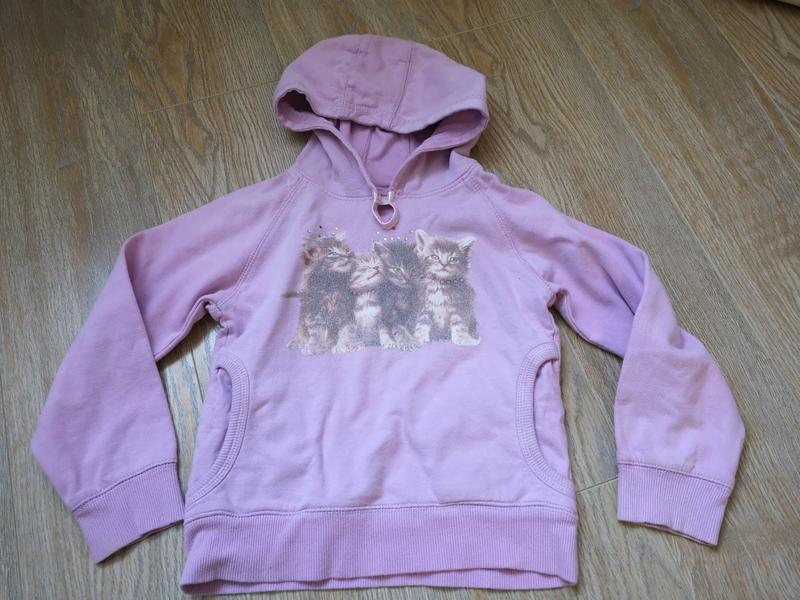 Теплый х/б худи с начесом. Спереди ретроаппликация - котики. Длина 37см ПОГ 29см Рукав 37см В этой модели худи была неудобная горловина, носили в ателье, мастер сделала вставку розовой с люрексом резиночкой. На фото видно. Дефектов нет. Доставку оплачивает покупатель.