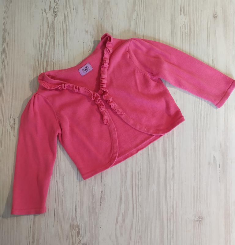Кофтинка для маленької принцеси,чудово підійде до платтячка з коротким рукавчиком. Гарного,насиченого рожевого кольору. Стан прекрасний.