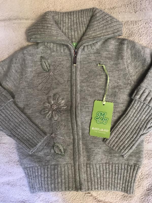 Теплая ангоровая кофта на девочку от бренда Many &many.Цвет серый.Размер 104,110р.Спереди аппликация из цветов.Сзади однотонная.Рукава длиные на широком манжете.Застежка на молнии. Состав:80%ангора,20%акрил.