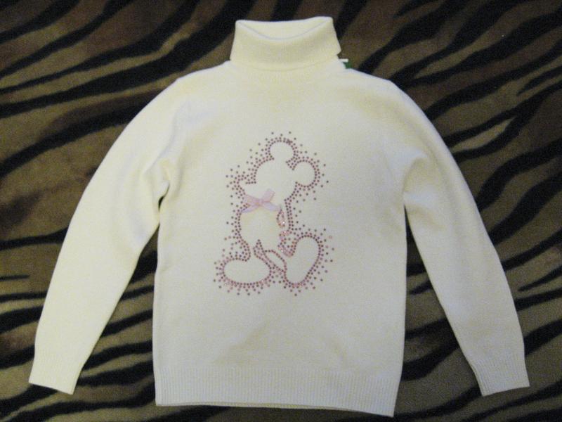 новый нарядный свитер гольф на рост 120-122, состав 90%коттон,9% нейлон,1%спандекс Белый с рисунком Микки из стразов длина 43см, ширина 32см, рукав от плеча 42см - 360грн