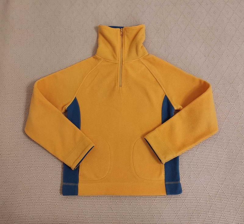 Флісова кофта in side Зріст: 152 см Колір - жовтий + блакитний. Склад: 100% поліестер. Кофта в дуже хорошому стані. ЗАМІРИ: Довжина - 51,5 см Довжина від пахви - 29,5 см Ширина (від пахви до пахви) - 40,5 см Довжина рукава від горловини - 60 см