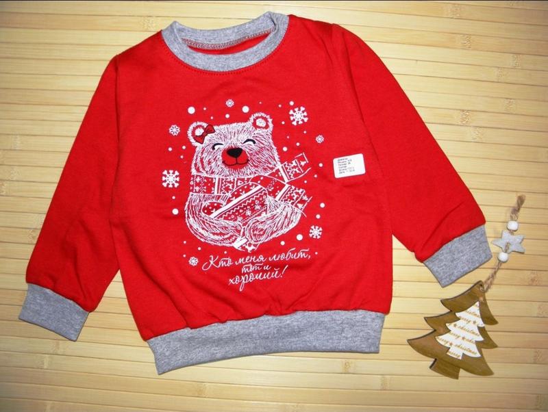 Новогодний джемпер Мишка Отличное качество, трикотаж 100% хлопок, внутри начес Яркая праздничная расцветка! р. 26, 28, 30, 32 Замеры: Длина/ПОГ/Рукав р. 26 - 34/28/29 красный р. 28 - 37/30/31 серый р. 30 - 38/31/33 красный р. 32 - 43/33/36 серый