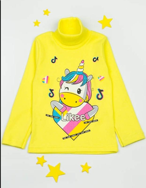 Пошита из трикотажного полотна -рубчик.Водолазка однотонного цвета с удаленным воротником и украшена интересным принтом