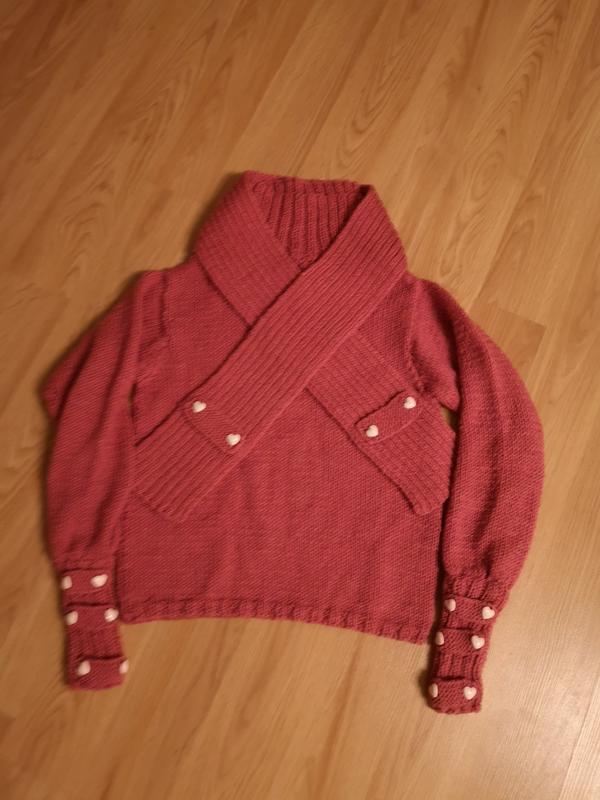 Мягкий теплый комплект шарфик и свитерок, длина по средине спинки 45 см, плечи 34 см, рукав 54 см, манжет 14 см (с митенками, одевается на большой пальчик), подмышки 38 см, низ 36 см, ворот 14 см. Шарф ширина 20 см, длина 124 см.