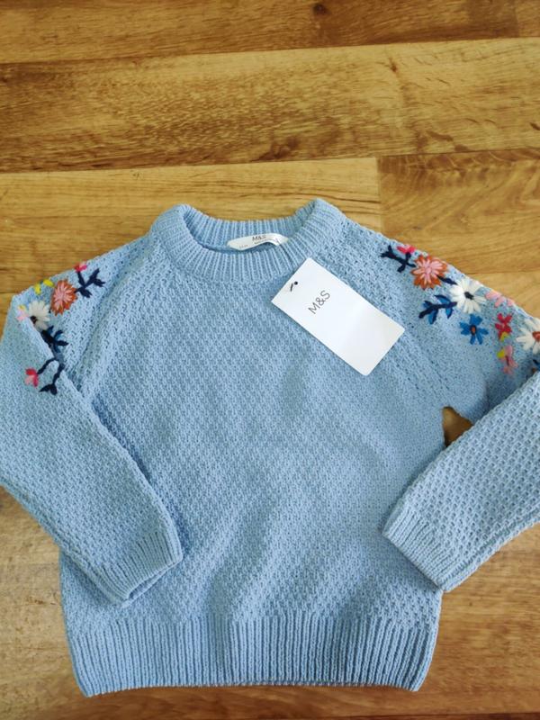 Свитер Marks & Spencer, очень мягенький, акриловый. Аппликация - вышитые цветы на рукавах. Размер: - 2-3 года (98 см)