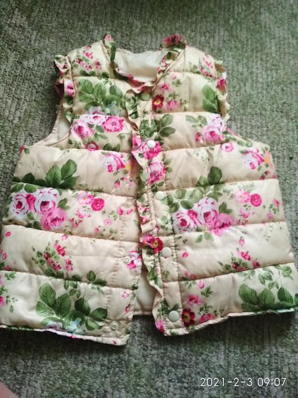 Красива жилетка для дівчинки, купували на 104,на фото 110, дуже яскрава річ, нам мала ідеальний стан, кнопки робочі дірок плям немає. Довжина 42,ширина 35.Красиві воланчики на шийці і на рукавчике.Замовляла з Китаю.