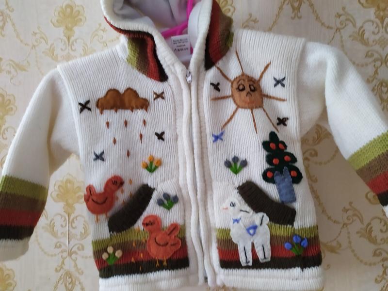 вязаная на флисе, с капюшоном, на молнии, можна в виде куртки, очень теплая