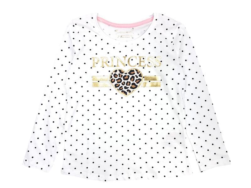 Стильный белоснежный лонгслив на девочек от Primark, Германия. Детский лонгслив в горошек по всей поверхности с ярким, золотистым принтом на груди и леопардовым сердечком. Мягкий и приятный к телу эластичный трикотаж отличного европейского качества. Состав - 100% хлопок. Изделие сертифицировано международной системой тестирования текстильной одежды - Oeko-Tex Standard 100. В наличии есть размеры: 110 на 4 - 5 лет. Длина 42, ширина под руками 32, плечи 25, рукав 38. Цена 228 грн.