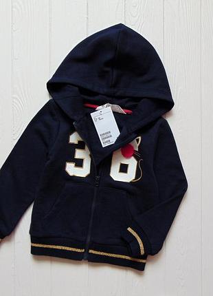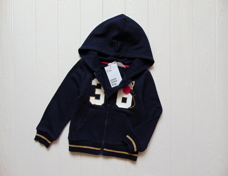 Новая кофта для девочки. Капюшон. Два боковых кармана. Застёгивается молнией. Насыщенный синий цвет. Внутри трехнить. Мягкий и приятный к телу материал, тянется. Шикарное качество. H&M. Размер 1.5-2 года. Состояние: новая, с биркой. Состав: 60% хлопок, 40% полиэстер. Замеры: длина 34 см, ПОГ 30 см, рукав от плеча 34 см, от горловины 39 см, по внутренней стороне 25 см, плечи 25 см. Материал тянется. Цена 250 грн.