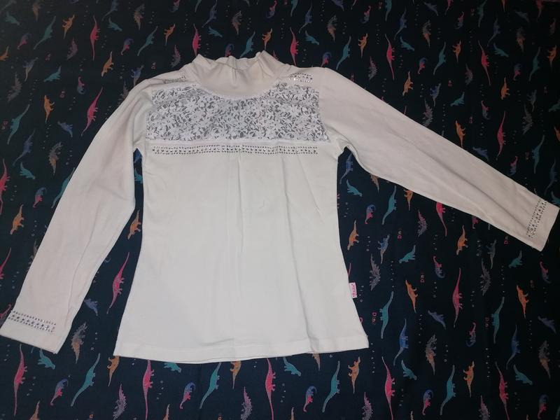 Красивый трикотажный белый гольфик, вверху вставка гипюра. В отличном состоянии, на рост 122 см.