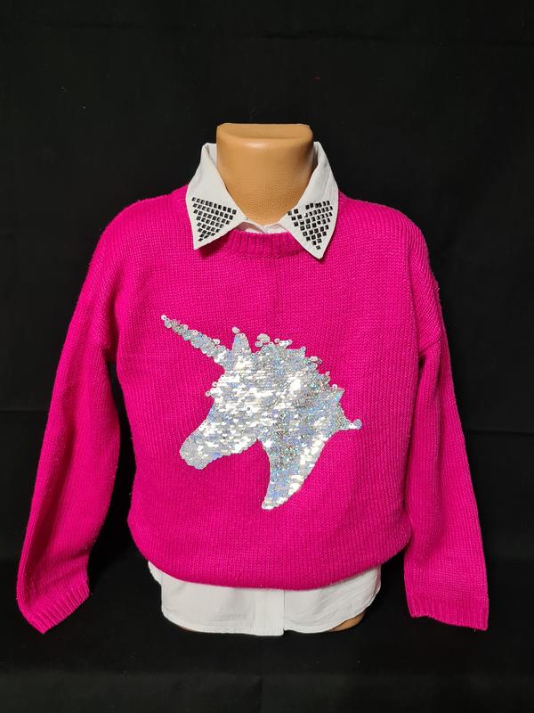 Дитячий светр з єдинорогом від next. Вік 6 років, довжина 45, рукав-37, плечі 44, ОГ 80, ВІД 74, по низу 36. Склад: 100% акрил. У відмінному стані!