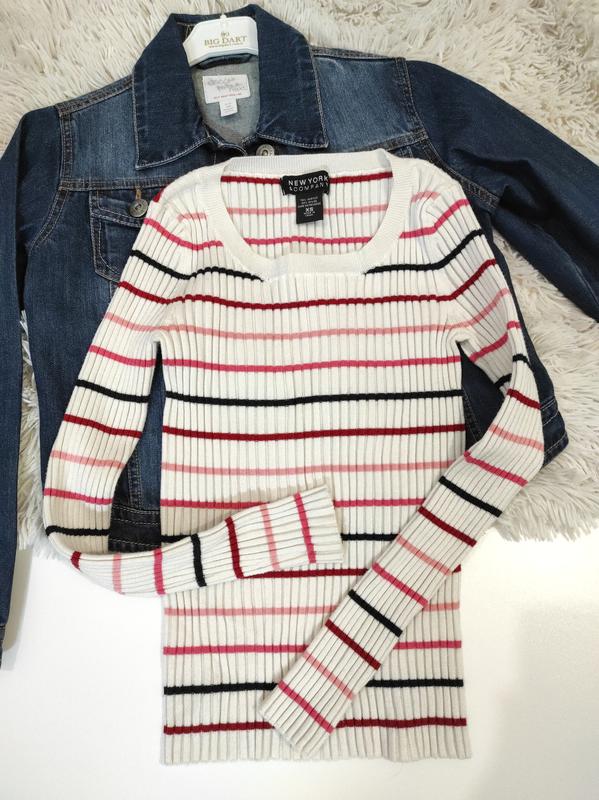 Молочный в полоску пуловер из стрейчевого трикотажа от New York & company. в очень хорошем состоянии и без дефектов. длина 51; рукав 54; грудь 31- 42