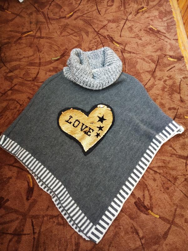 Накидка на дівчинку,в'язана,сірого кольору. Довжина 57см Шия 26см Довжина від шиї(імітований рукав) 36см