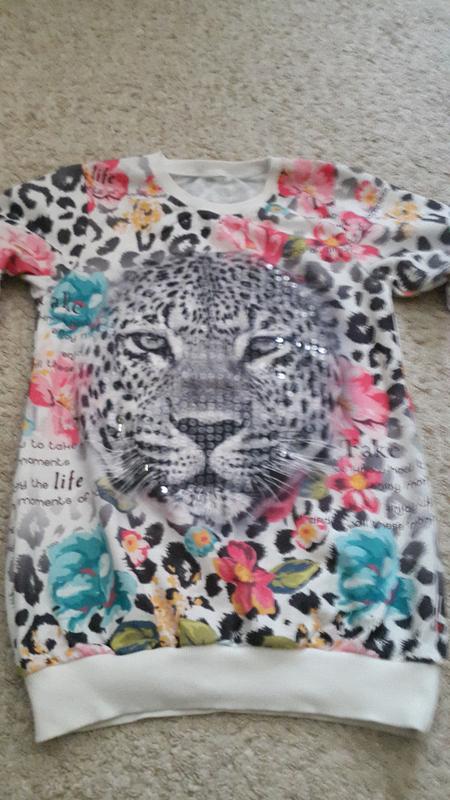 Очень красивая туника, но можно носить и как свитер. На рост 146см. Аккуратная , ни одна паетка не отпала. Есть манюни катышки( на последнем фото пример). Резинки нигде не растянуты