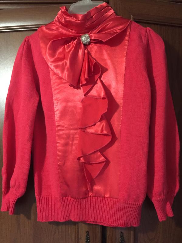 Яркий нарядный свитер с шелковым жабо и украшением пришитой брошью. Состав хлопок. Замеры длина 55см от плеча, плечи 34, подмышки 30, рукав 50. Бирка бренда срезана. Покупала в Антошке.