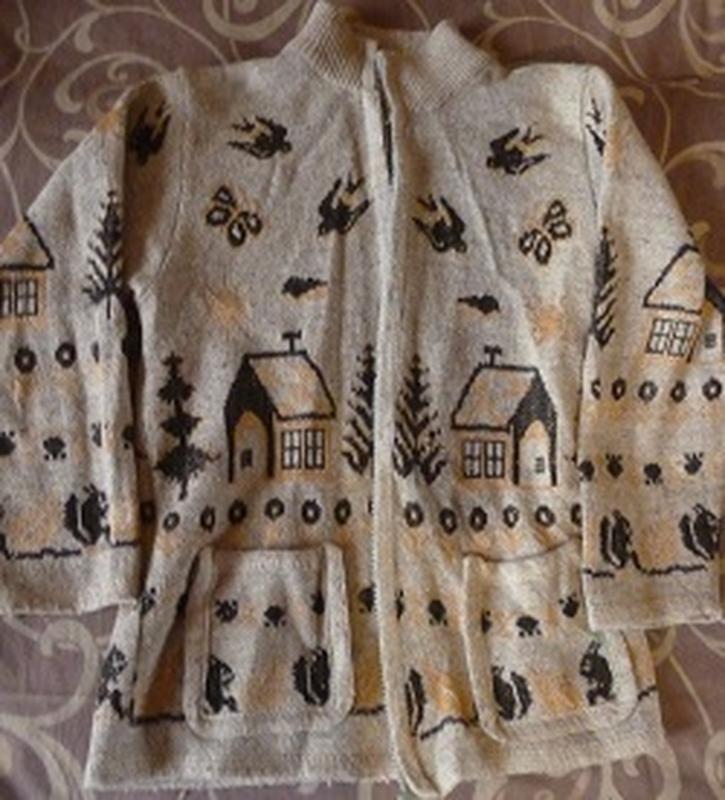 Теплая кофта для девочки с интересным рисунком..В хорошем состоянии.Рукав 3/4.На возраст 7-10лет.