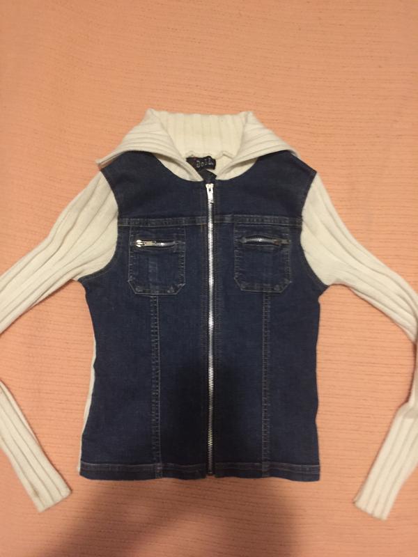 Кофта на молнии, впереди джинс , есть карманы, есть пятна на правом рукаве, есть на фото, ширина плеч 35 см , ширина груди 40 см , длина рукава 62 см , длина по спине 45 см ,размер S .