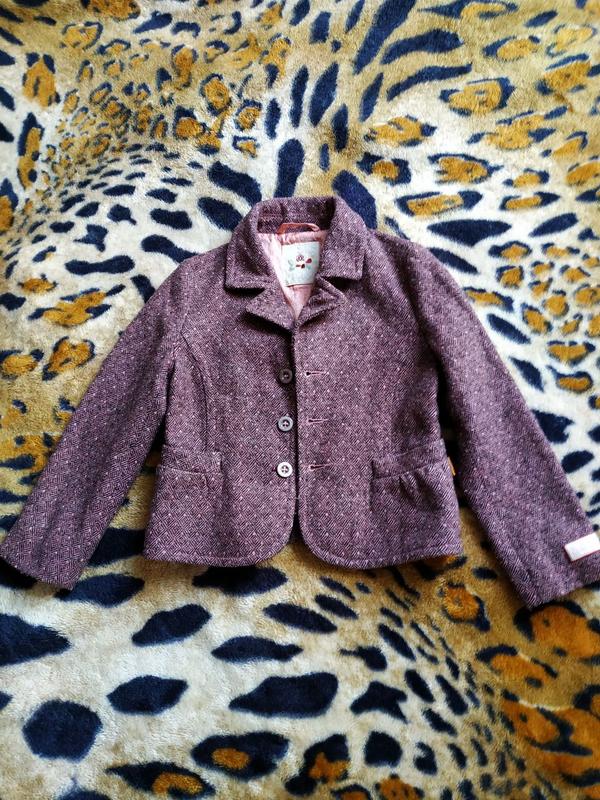 Очень классный пиджак, перламутровые пуговицы, шлица сзади, круто смотрится на ребенке.Можная в школу,вин теплый.Из дефектов порезанная подкладка внутри,на фото указала.