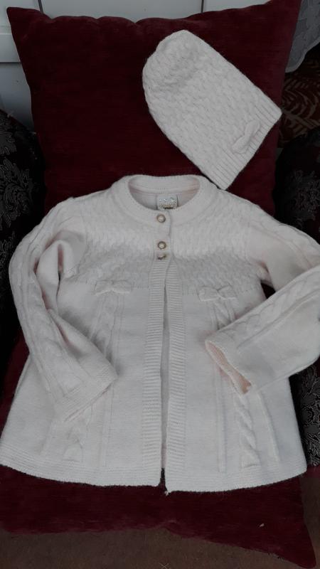 Дуже гарний кардиганчик блідо рожевого кольору для дівчинки ростом 128-134см, можна і на 122 см. Стан нового, в комплекті йде шапочка
