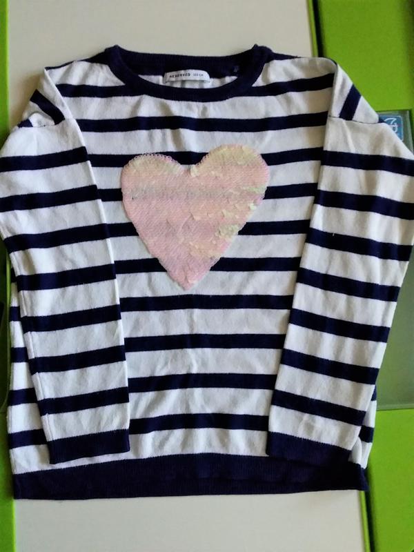 Неймовірний джемпер Reserved з паєтками дівчинці в синьо-білу смужку. М'який, приємний. Серце з блискучими паєтками (2 кольори змінюються). Склад: 80%-віскоза, 20%-поліамід. У відмінному стані як новий! Розмір в наявності - 122р. Заміри: довжина від плеча-44см, ПОГ-39див, рукав від плеча-34см.